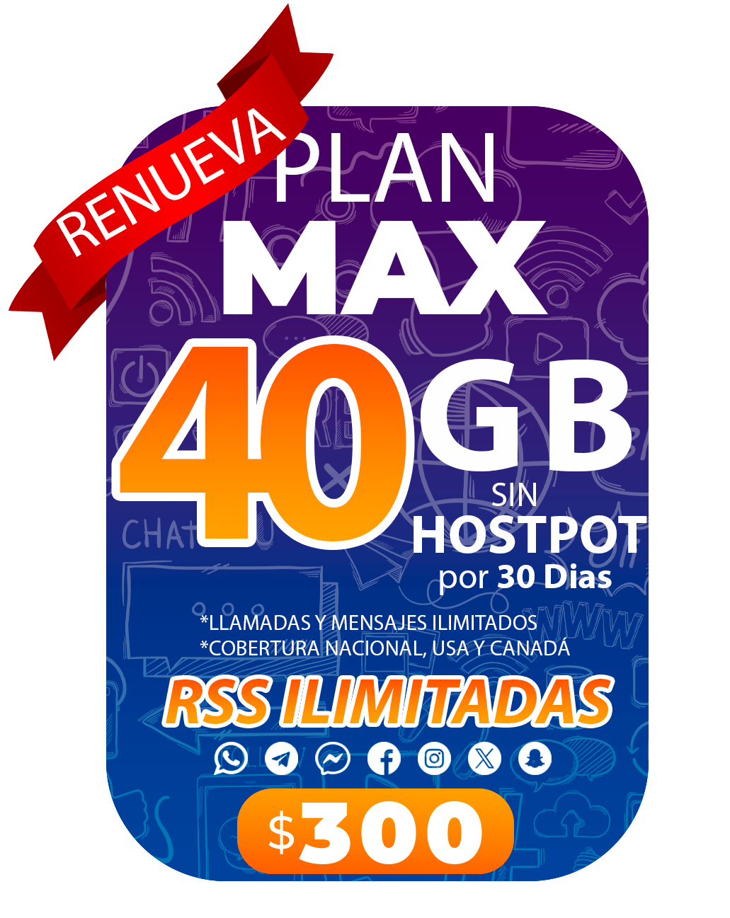 • Redes sociales ilimitadas: WhatsApp, Telegram, Messenger, Facebook, Instagram,