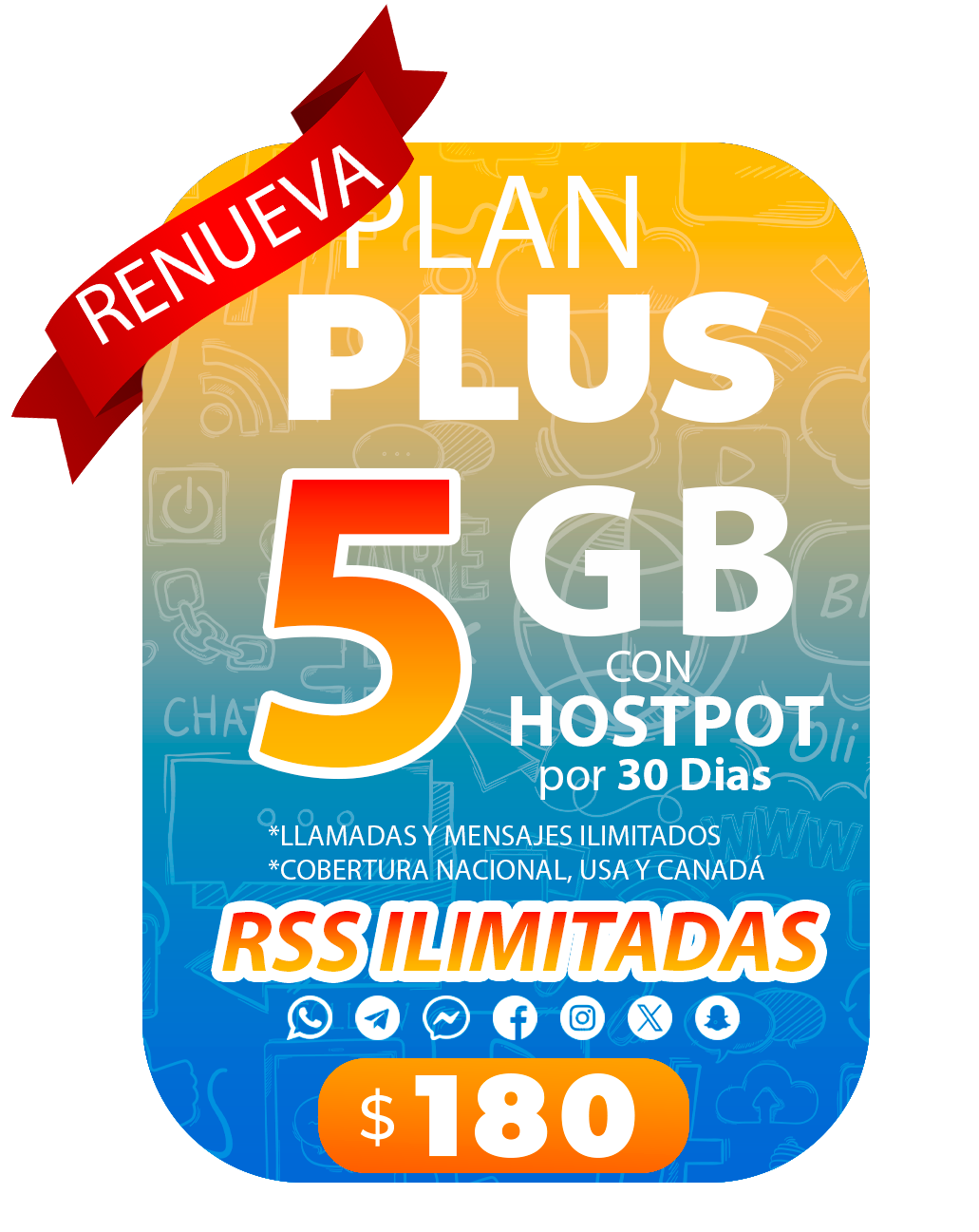 • Redes sociales ilimitadas: WhatsApp, Telegram, Messenger, Facebook, Instagram,